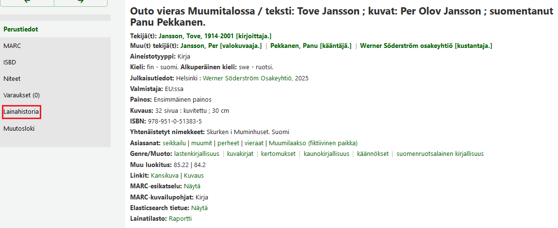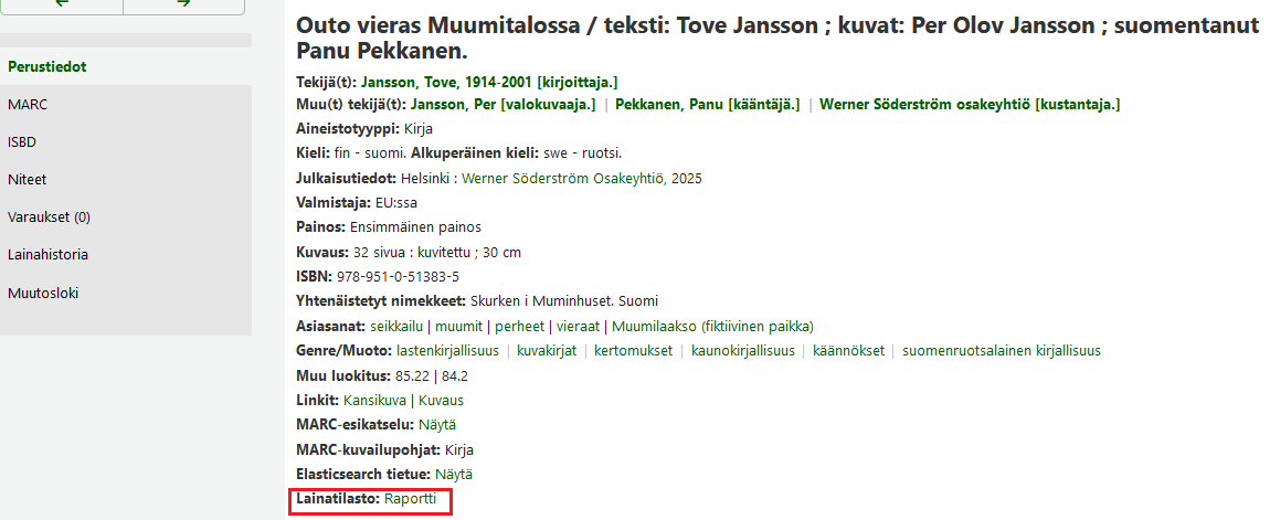 | 952$7 | Ei lainattavissa | Oletusarvot: 0 = (tyhjä) –1 = Tilattu 1 = Ei lainata 2 = Henkilökunnan käsikirjasto |
