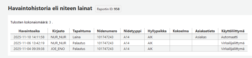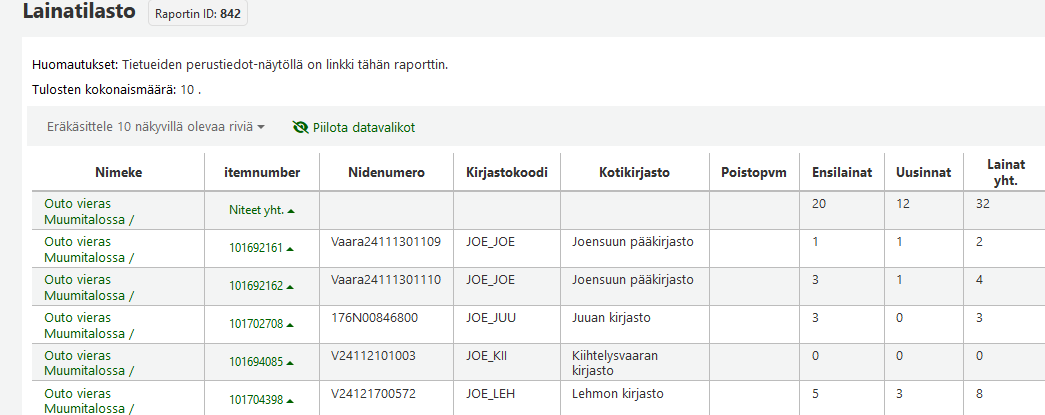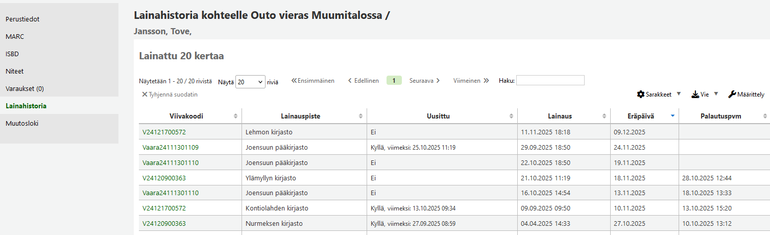 - Virkailija-sarakkeessa näytetään muutoksen tehneen virkailijan borrowernumber.