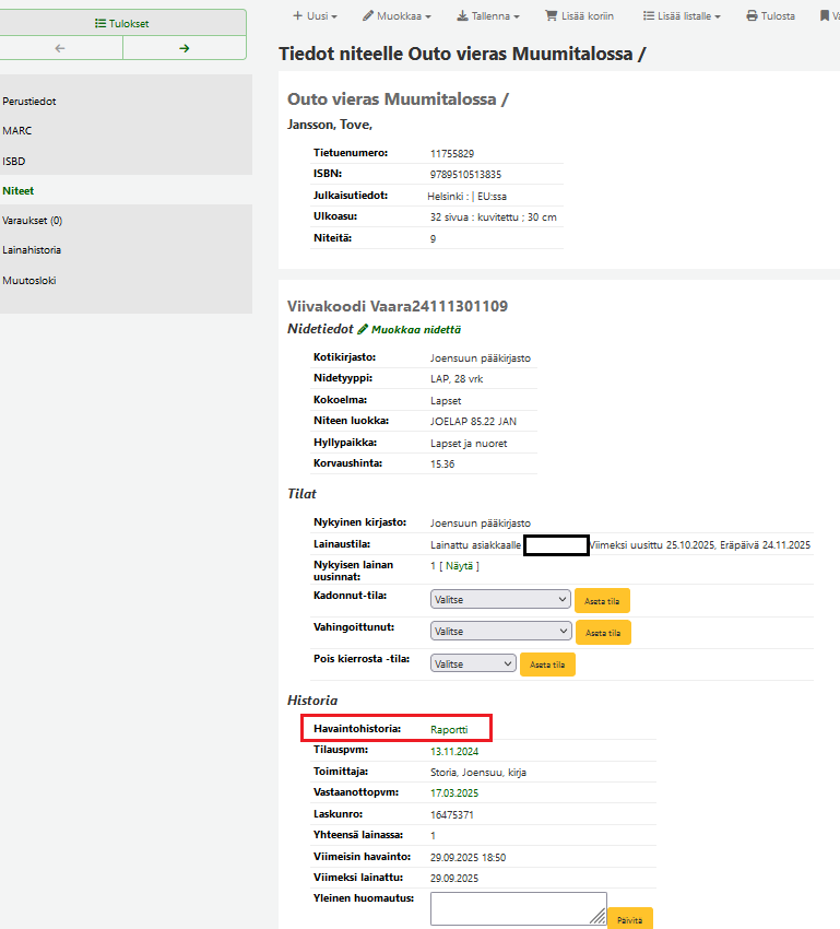 | 952$x | Huomautus virkailijoille | Tämä huomautus ei näy verkkokirjastossa. Tällä hetkellä tämä huomautus näkyy vain niteiden muokkausnäytöllä ja Niteet-välilehdellä virkailijatyökalussa. | |