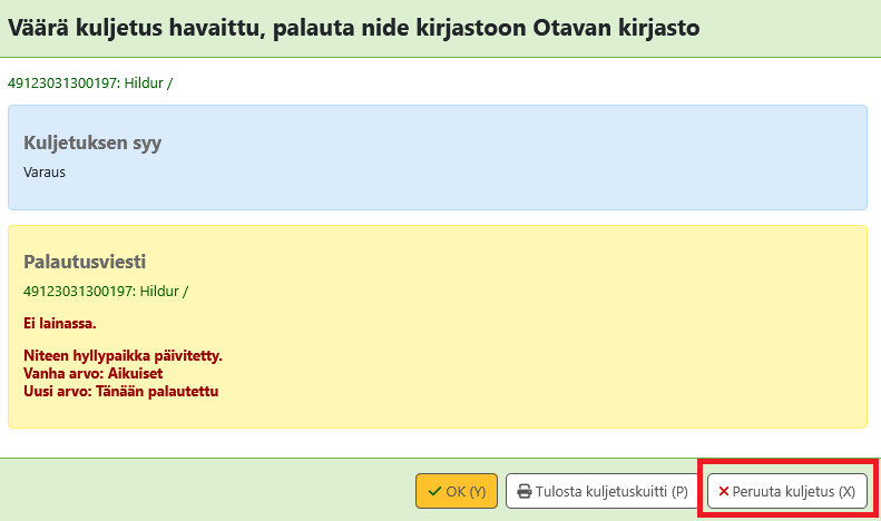 Niteen kuljetustila poistuu asiakkaan tiedoista, mutta niteen tiedoista kuljetustilan voi poistaa seuraavasti: 1) Palauta nide. 2) Valitse varauksesta ilmoittavassa pop up -ikkunassa ”Peruuta kuljetus”.